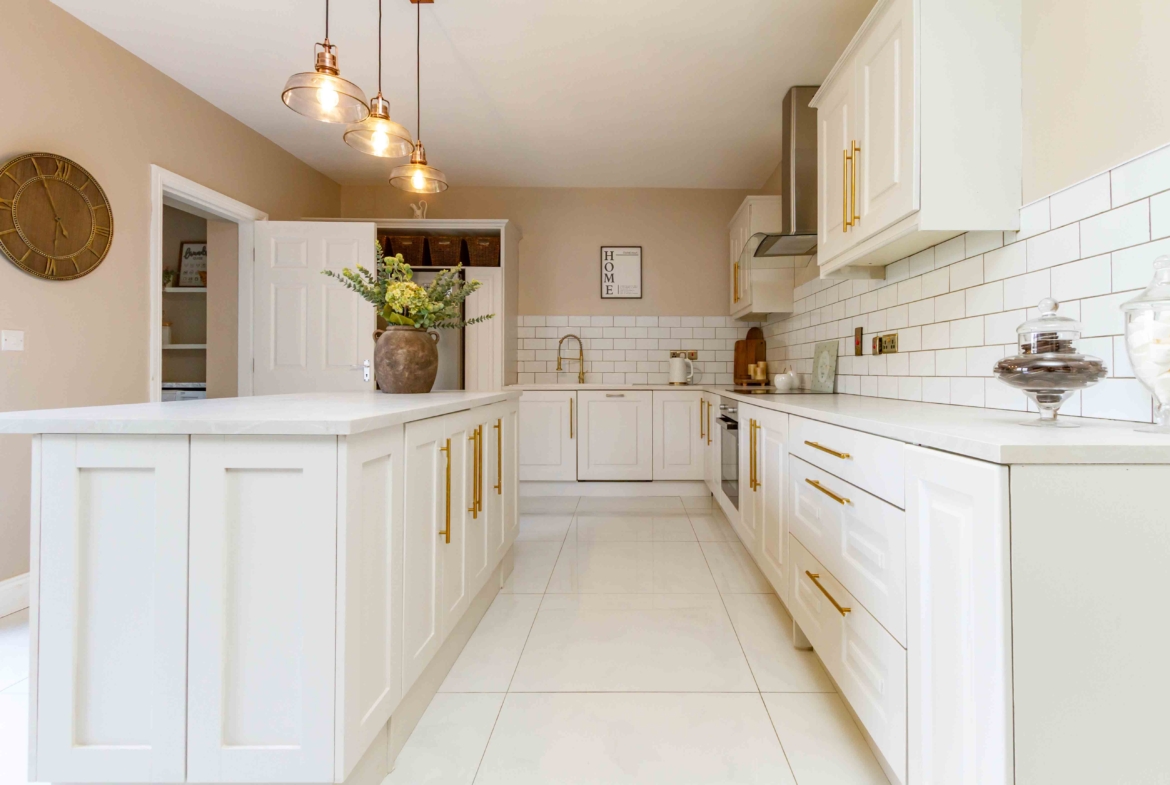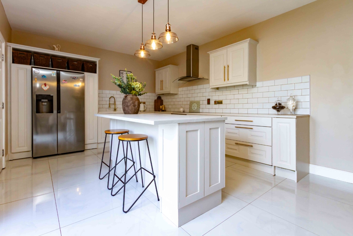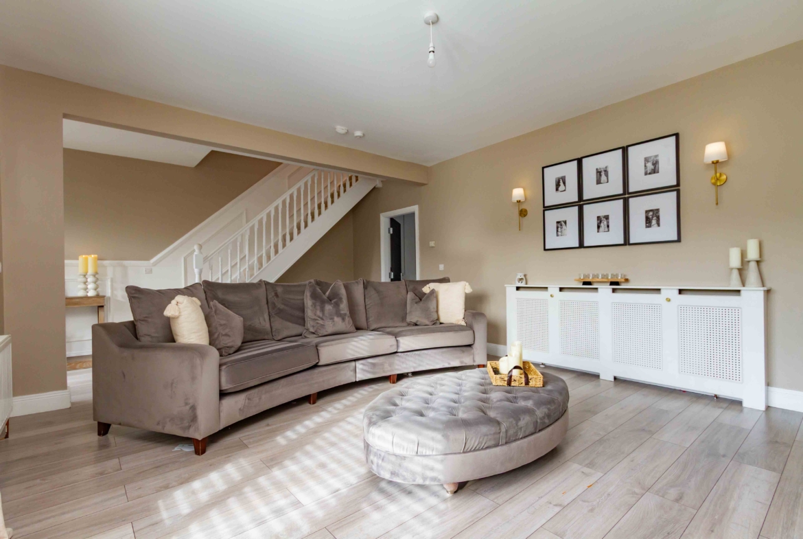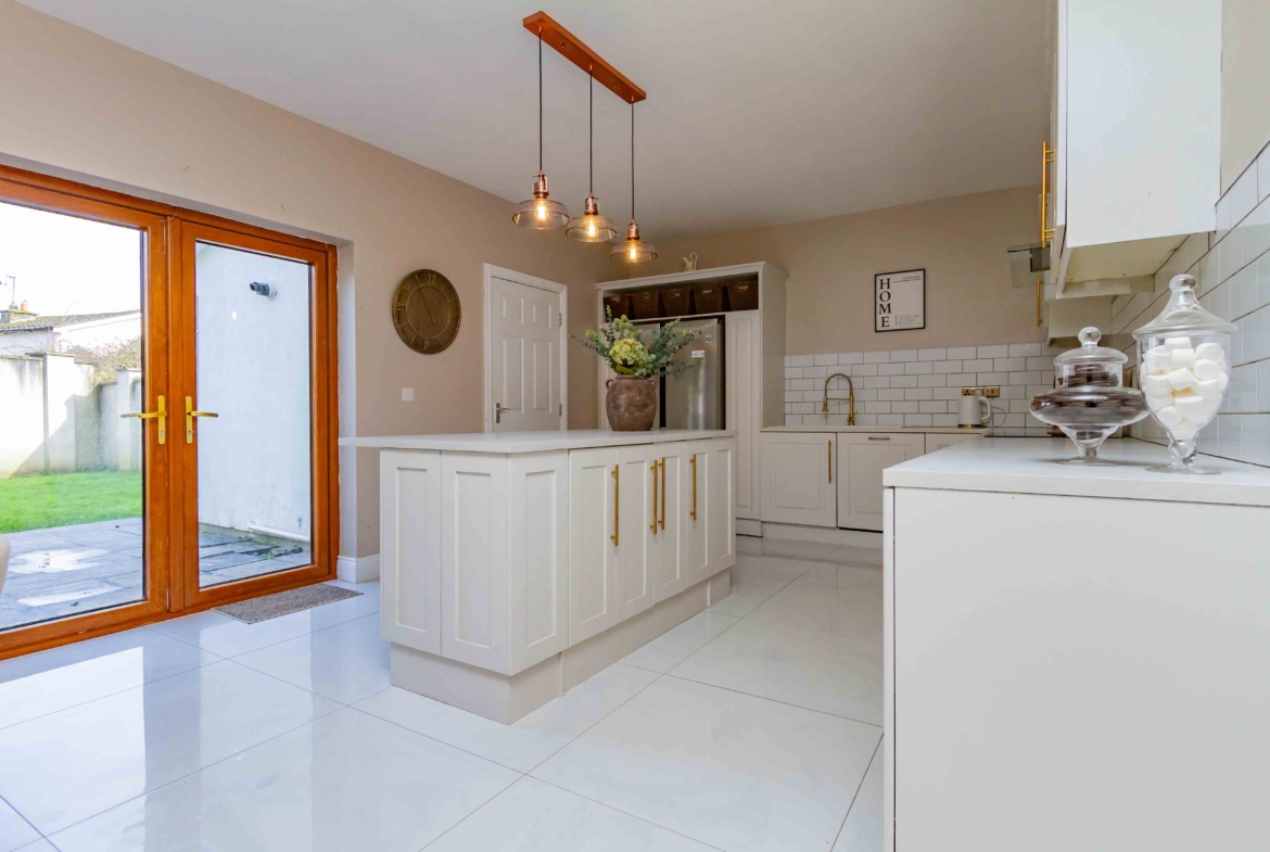 Presented in pristine, turnkey condition, this home has been finished to an impeccable standard throughout. The accommodation is both generous and beautifully presented with notable features throughout. A spacious living room to the front provides an elegant and welcoming retreat, while to the rear, a substantial sun-filled kitchen and dining area forms the true heart of the home. The stylish kitchen provides a social layout for modern day living thanks to the addition of an island. Tastefully decorated, the classic subway tiles and panelling details exude charm and character in the heart of the home while patio doors frame the views of the garden.