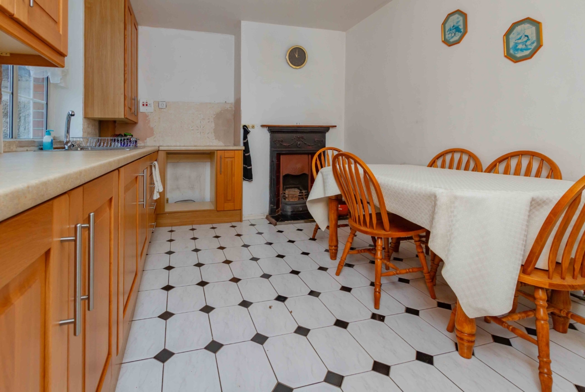 On the ground floor it comprises an entrance hall, living room with feature fireplace, a kitchen/dining room, and a conveniently placed bathroom.