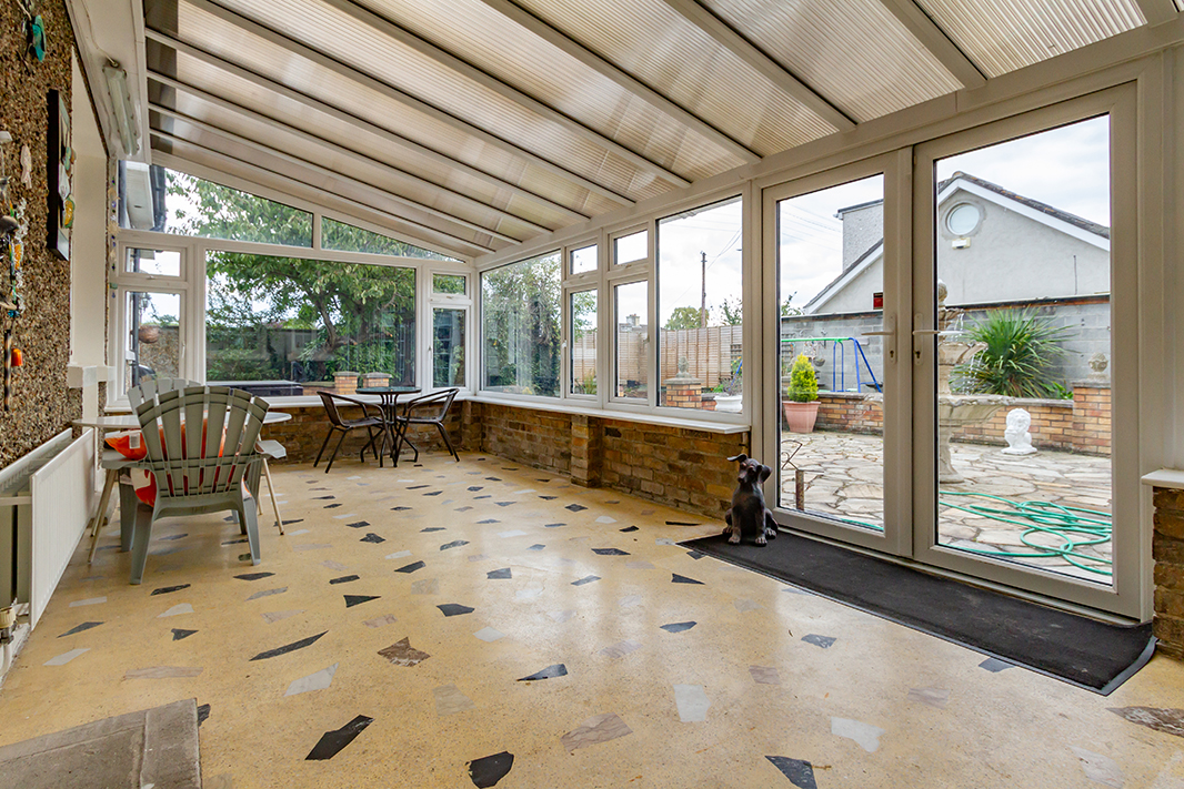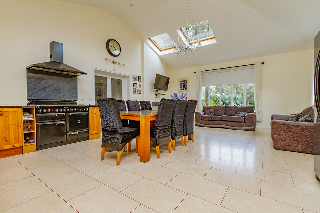 Upon entering, you are greeted by a spacious entrance hall which leads to a bright and welcoming sitting room with feature fireplace and dining area. Off the living room lies a truly stunning open-plan kitchen, complete with vaulted ceiling and large skylight windows that flood the space with natural light. To the rear you enter into a conservatory with terrazzo flooring, ideal for year-round enjoyment.